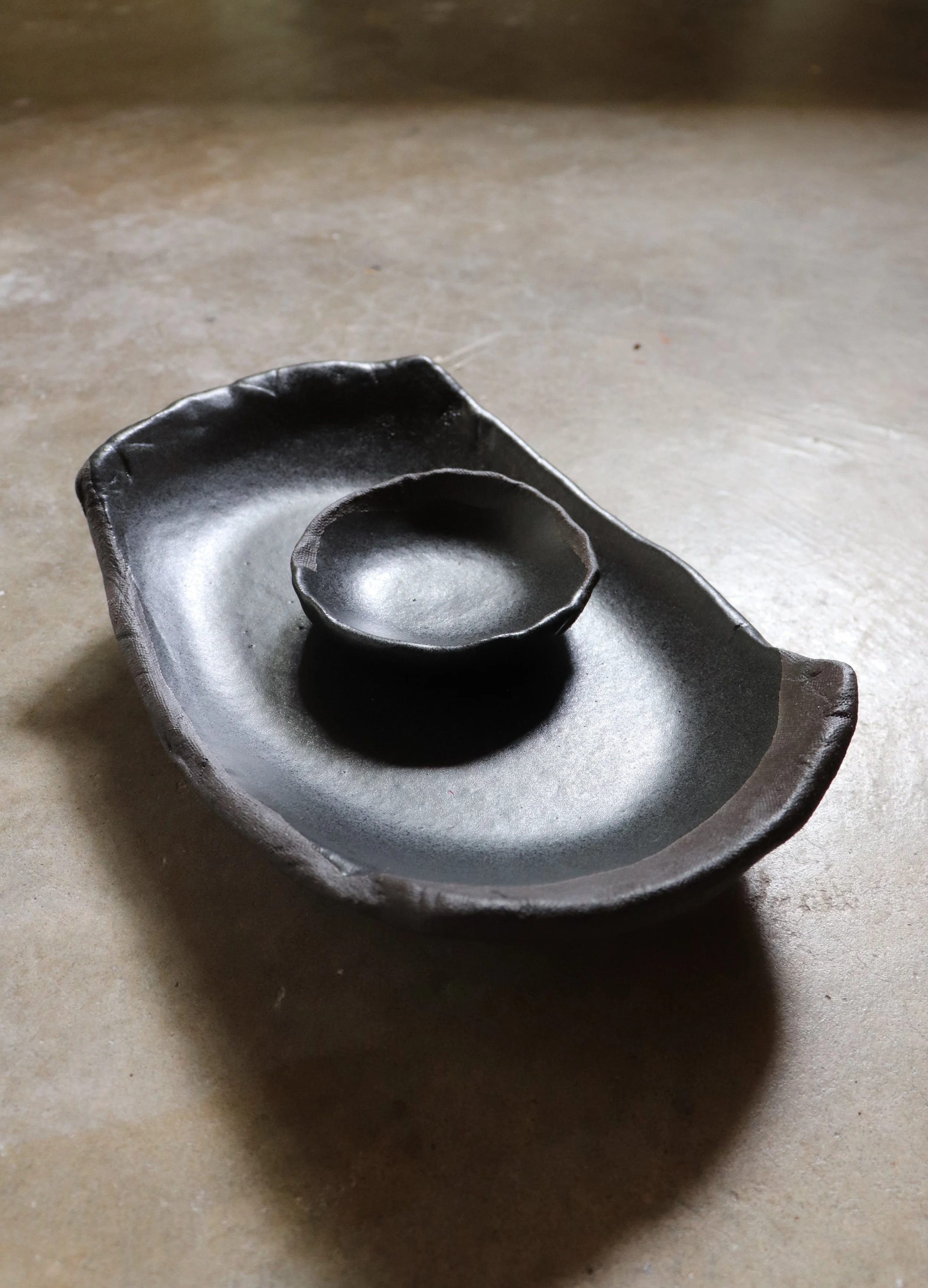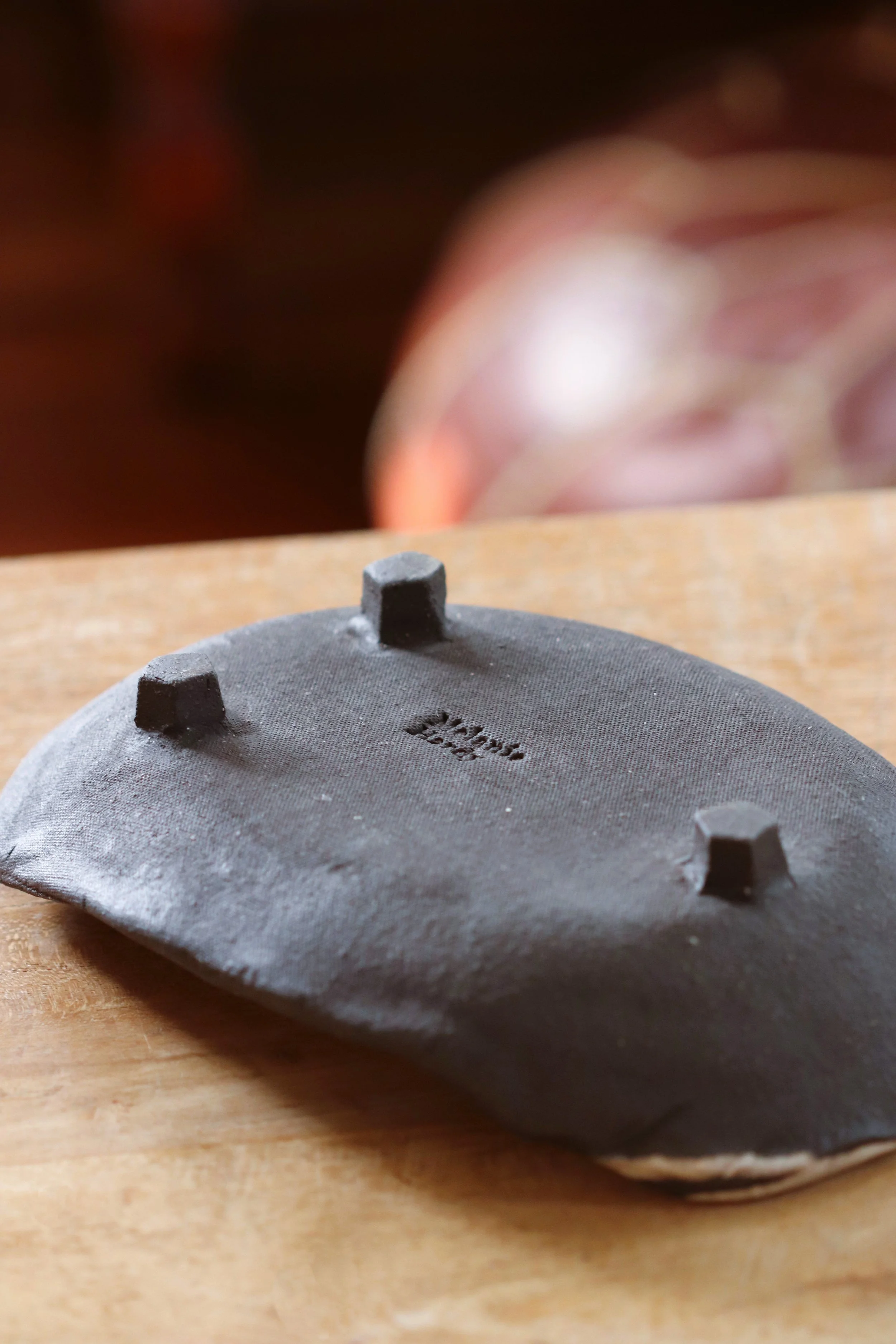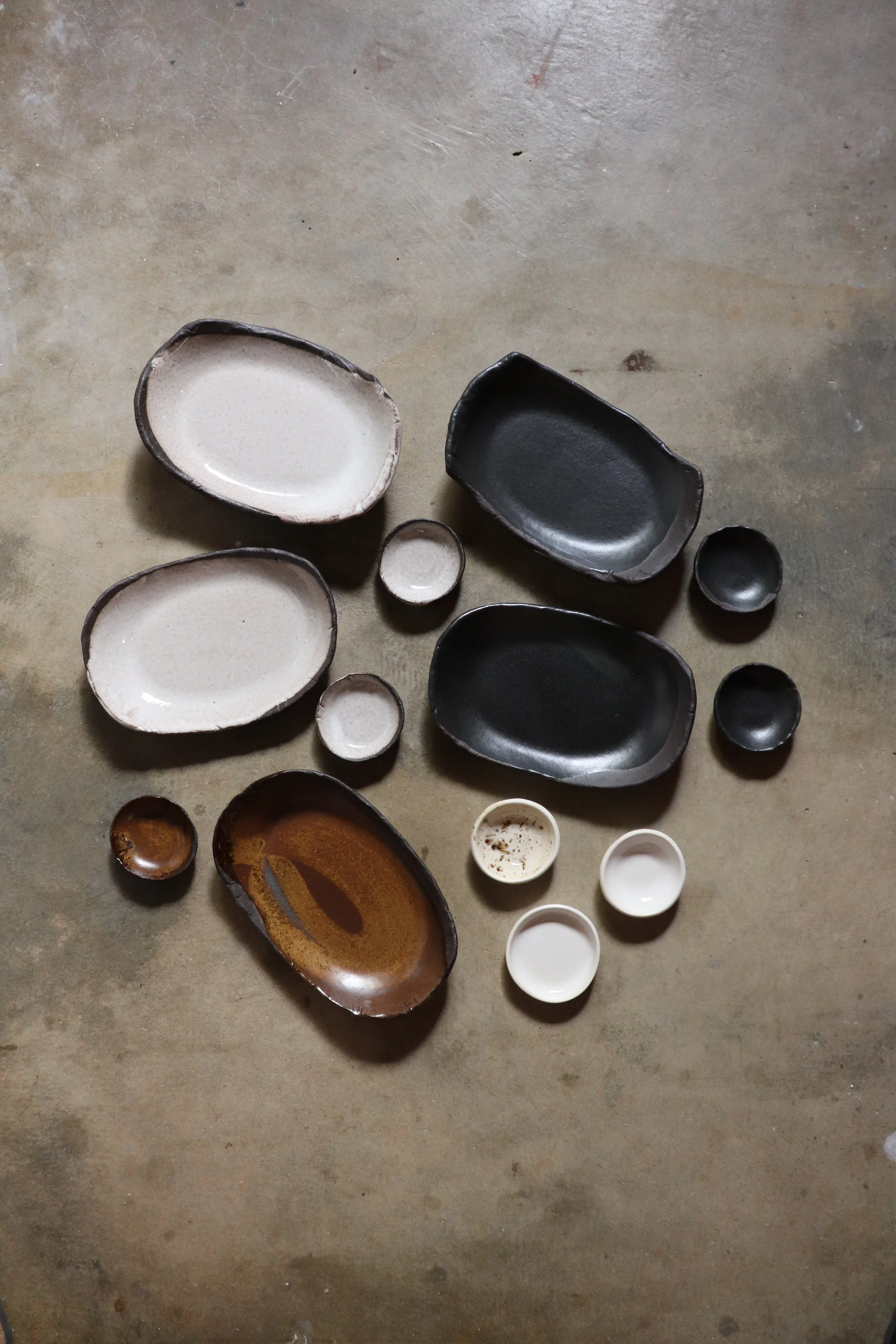 Below are some of the images of the plateware designs that were created for this restaurant. Each piece needed to be robust enough for purpose, food safe, dishwasher friendly, stackable yet created with individuality. The dark clay body was selected by Mark and pieces were designed to have a rustic organic style with a little bit of a Wabi-Sabi Japanese influence.